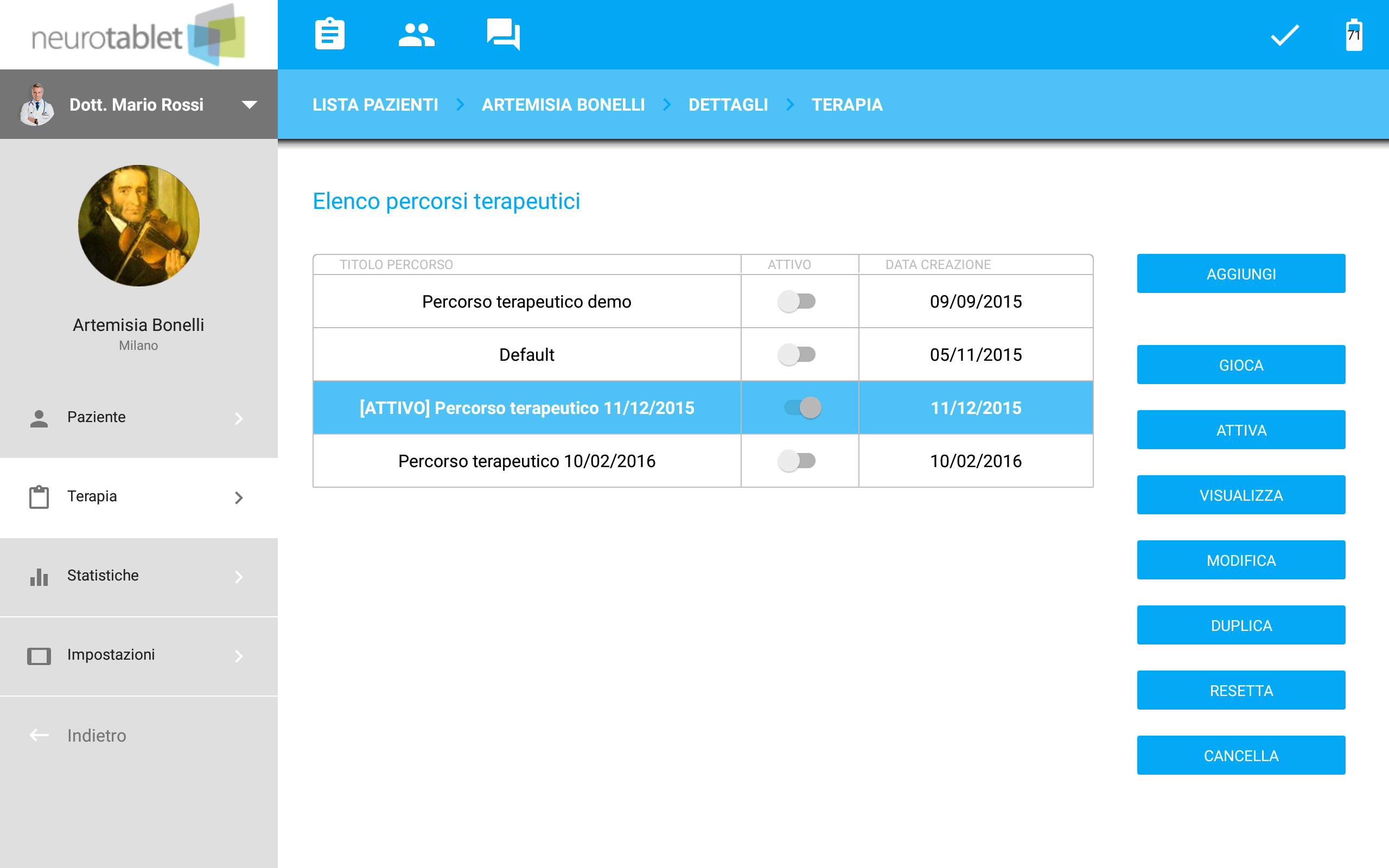 Il Neurotablet ha un'interfaccia specifica per gestire a distanza le terapie dei pazienti che si sta seguendo. Questa interfaccia è costruita per modificarsi con il variare degli obiettivi e del progresso del paziente. In ogni momento, il paziente sa a che punto della terapia è arrivato. Questo permette di fornire un'esperienza motivante, e di aiutarlo a diventare una parte attiva del proprio processo riabilitativo.